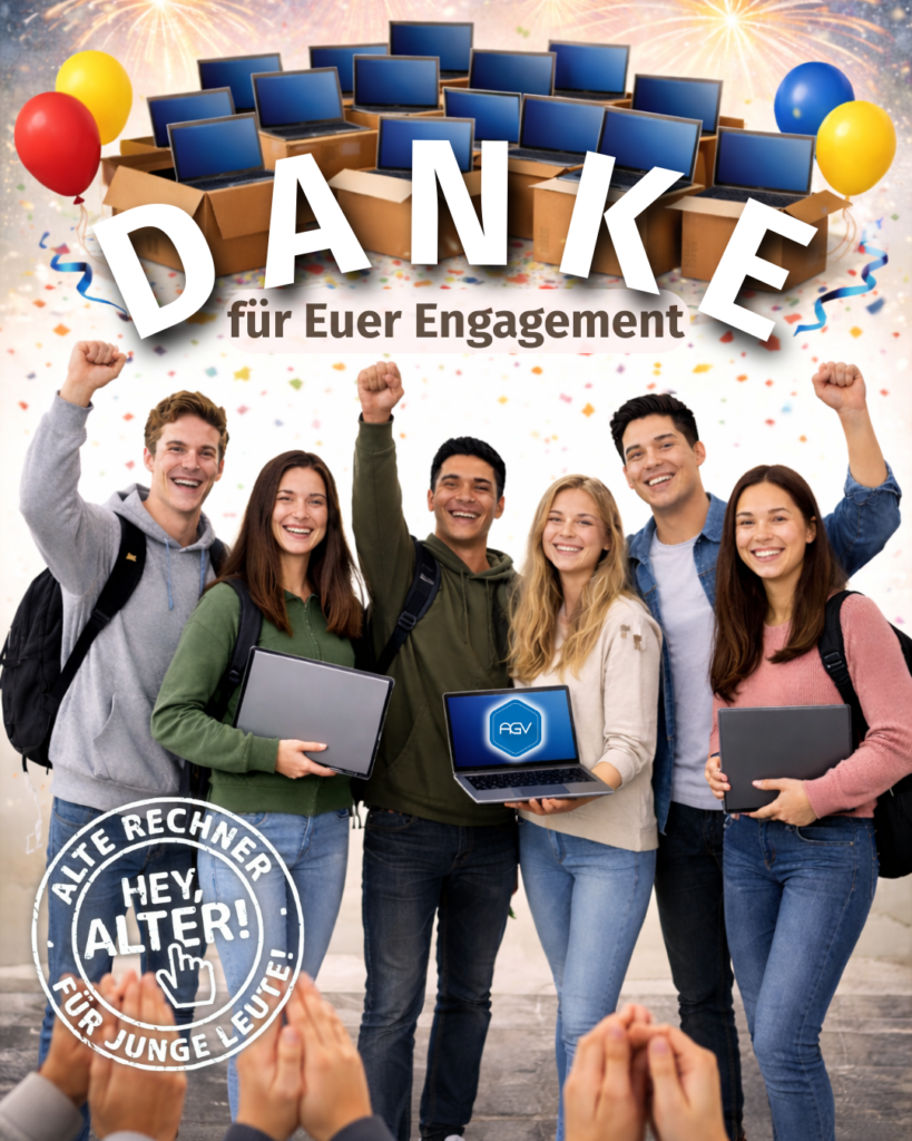 Das hat sich mal richtig gelohnt. Mit dem Abschluss unserer AGV-Spendenaktion vor Weihnachten konnten wir ein starkes, gemeinsames Ergebnis feiern: Insgesamt 825 gespendete Laptops bedeuten ganz konkrete neue Lern- und Zukunftschancen für Schülerinnen und Schüler in unserer Region, die bislang keinen eigenen Rechner hatten.