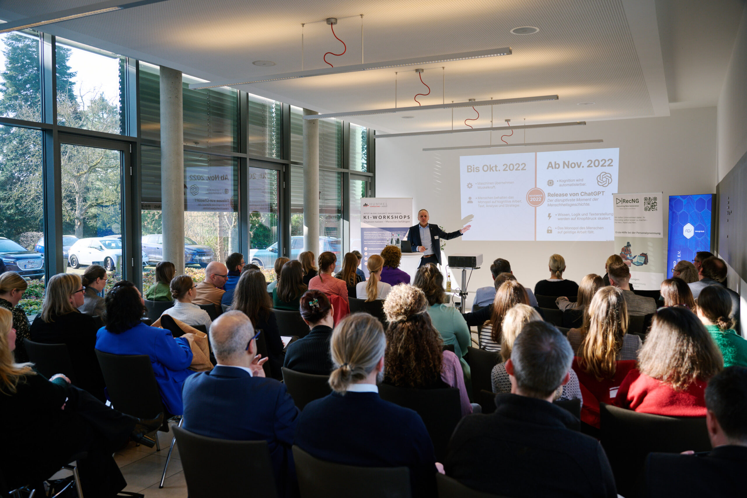 Den ersten Impuls lieferte der Unternehmer und KI-Experte Sascha Hummel. In seinem Vortrag „Auswirkungen der KI auf den Arbeitsmarkt im Jahr 4 nach ChatGPT“ zeichnete er ein realistisches Bild der Veränderungen, die sich bereits jetzt in vielen Branchen abzeichnen.